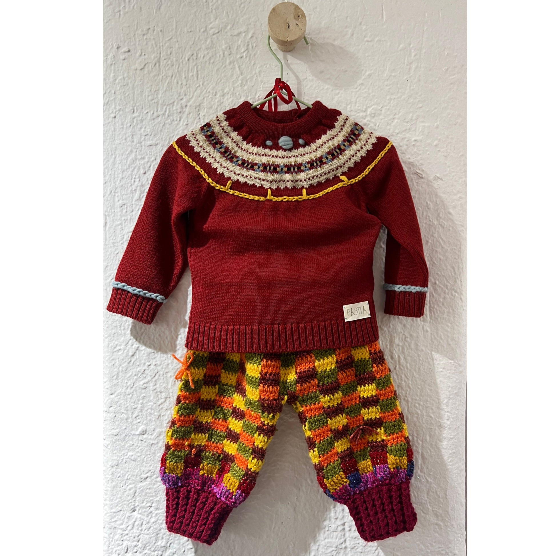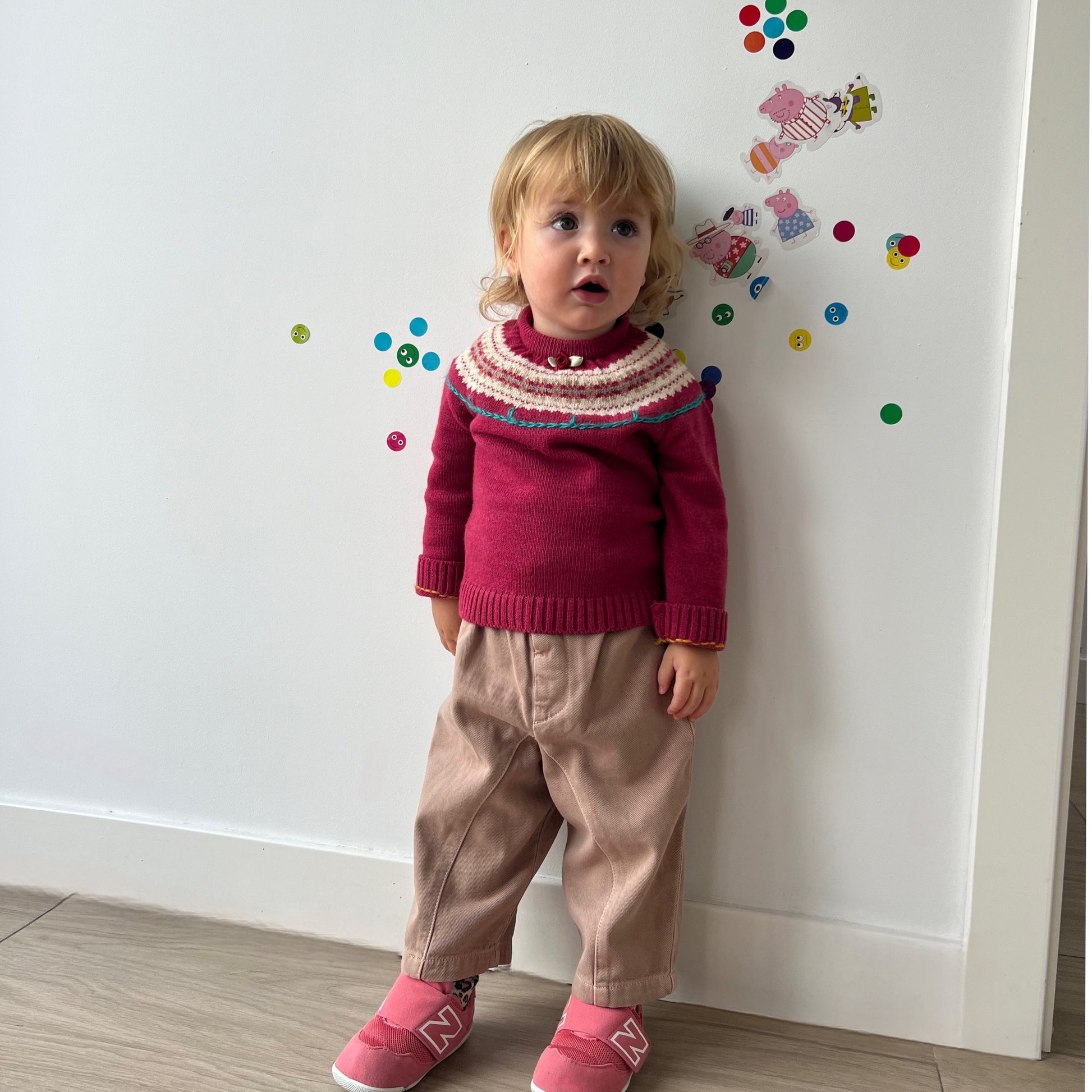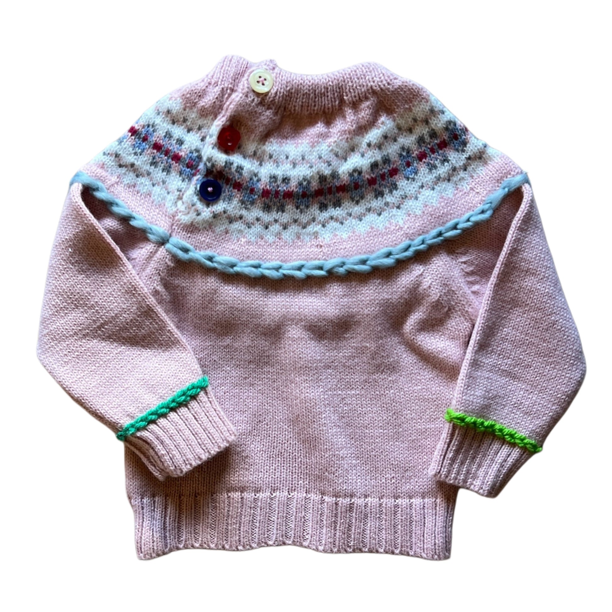 Suéter unisex con detalles bordados a mano (en lana), rosa roja y tres botones vintage en la parte trasera del canesú.