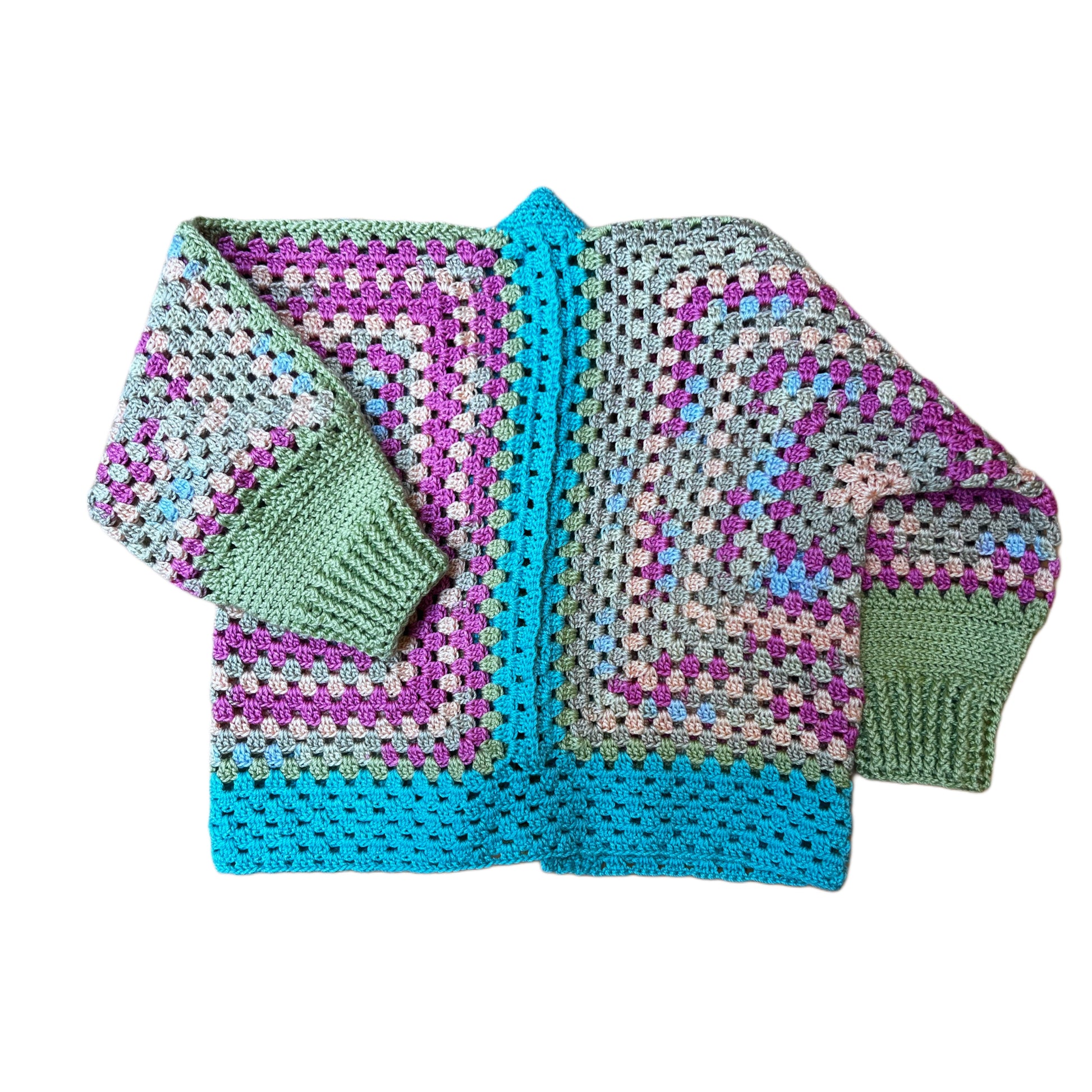 Charming and colorful cardigan made from breathable cotton yarn. Lightweight and comfortable, designed for babies and young girls to move freely and play with ease.