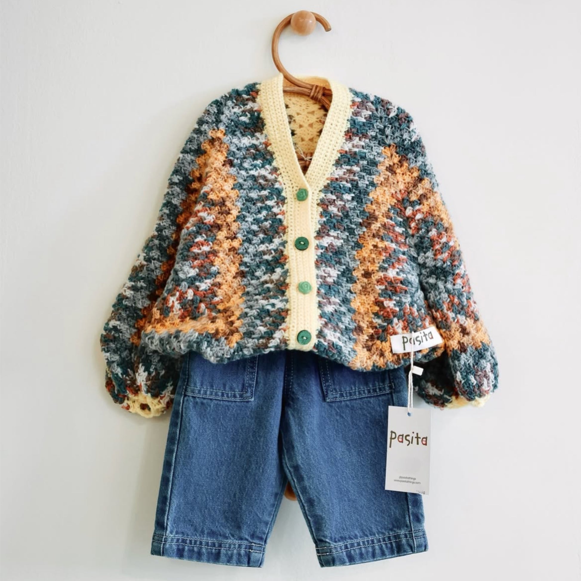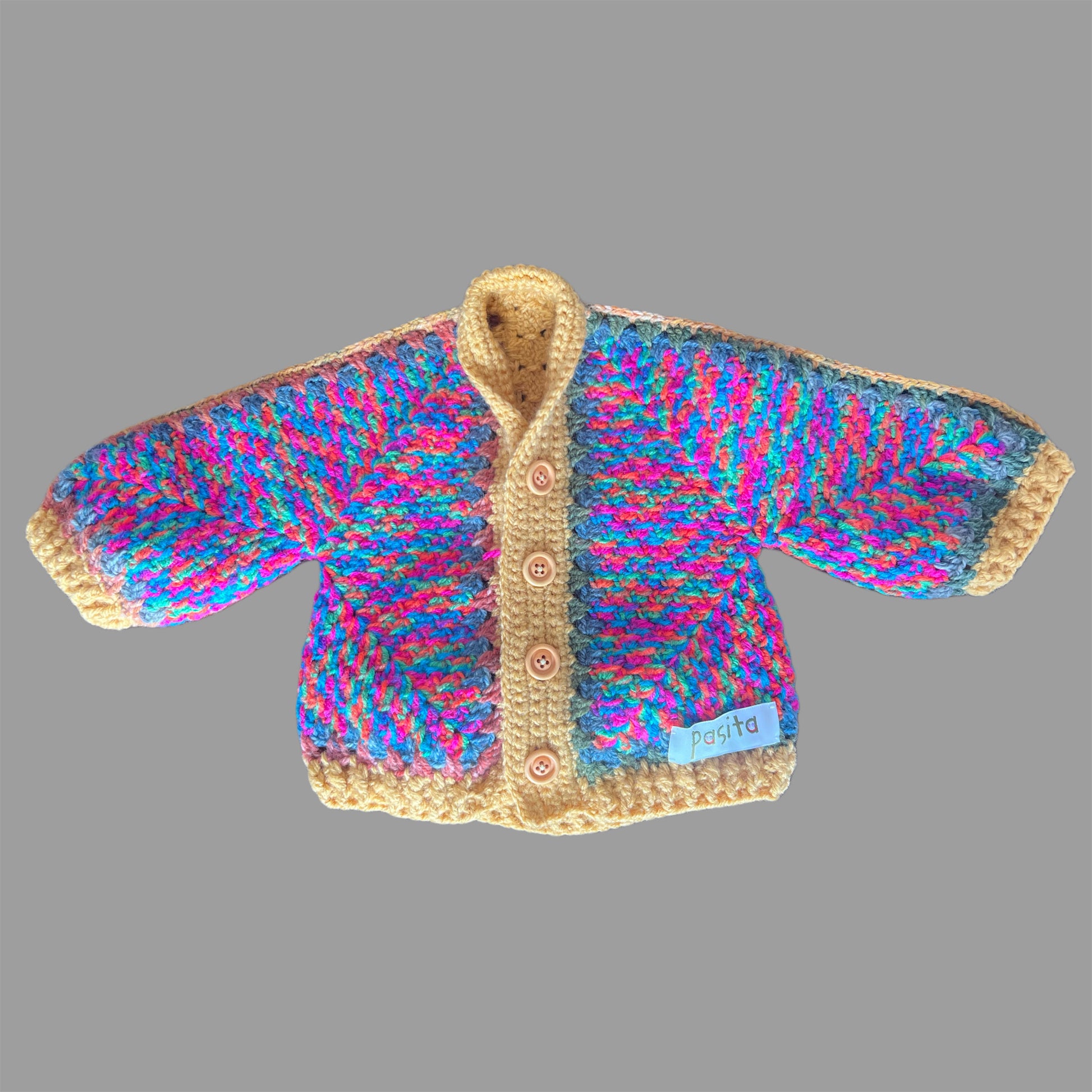 Charming and colorful Kimono cardigan with vintage buttons. Hand crocheted.