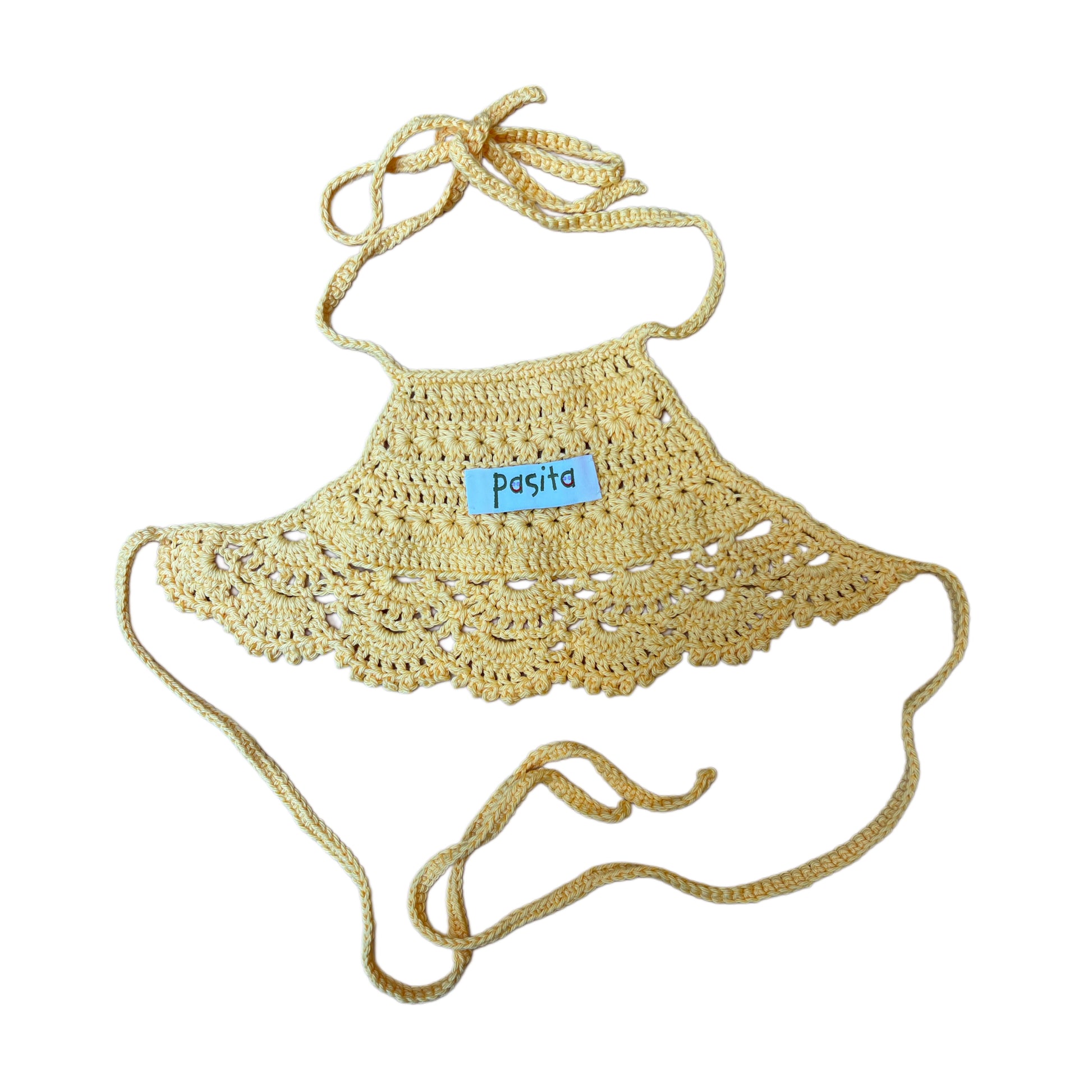 Playful hand-crocheted top with an open back. Tied at the neck and waist with delicate cords.